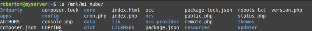 Entonces, la ruta absoluta en donde debo analizar y revisar las carpetas y/o archivos en el disco es en la siguiente ruta: «/mnt/mi_nube/data/remurillod80/files».